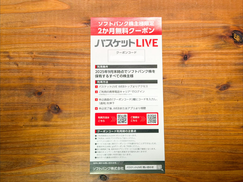 2025年12月15日 taka 2025年9月権利分、ソフトバンクから隠れ優待をいただきました。 内容は、バスケットLIVEの2ヵ月無料クーポンです。 …
