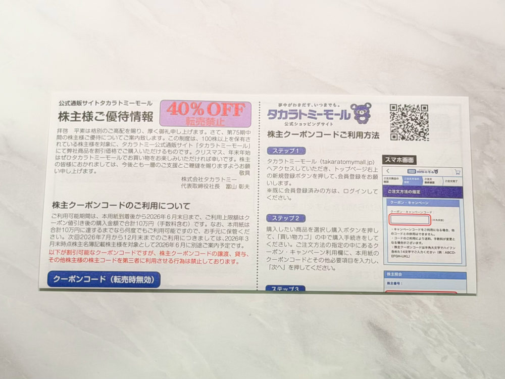 株主優待【割引クーポン】タカラトミーの株主優待が到着